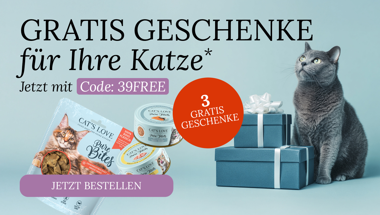 *Aktion gültig im CAT'S LOVE Onlineshop (ausgenommen catslove.com/it und catslove.com/es) von 12.02.2026, 09:00 Uhr bis 18.02.2026, 09:00 Uhr. Nicht kombinierbar mit anderen Rabatten oder Aktionen. Sale Ware, limitierte Produkte, Testboxen, Probepackungen, Abo-Bestellungen, Messbecher, Dosendeckel und Gutscheinkarten sind von der Aktion ausgeschlossen. Neukunden- und Vielbestellerrabatt können während des Aktionszeitraums nicht eingelöst werden. Das Gratisgeschenk kann ab einem Einkaufswert von 39€ mit dem Code: LOVE39 im Warenkorb beigelegt werden, keine Barablöse und nur solange der Vorrat reicht. Kann nicht mit Abo-Bestellungen kombiniert werden. Aufgrund der aktuellen Lage kann es zu verlängerten Lieferzeiten von bis zu 10 Werktagen kommen. Gültig nur für Endkunden.